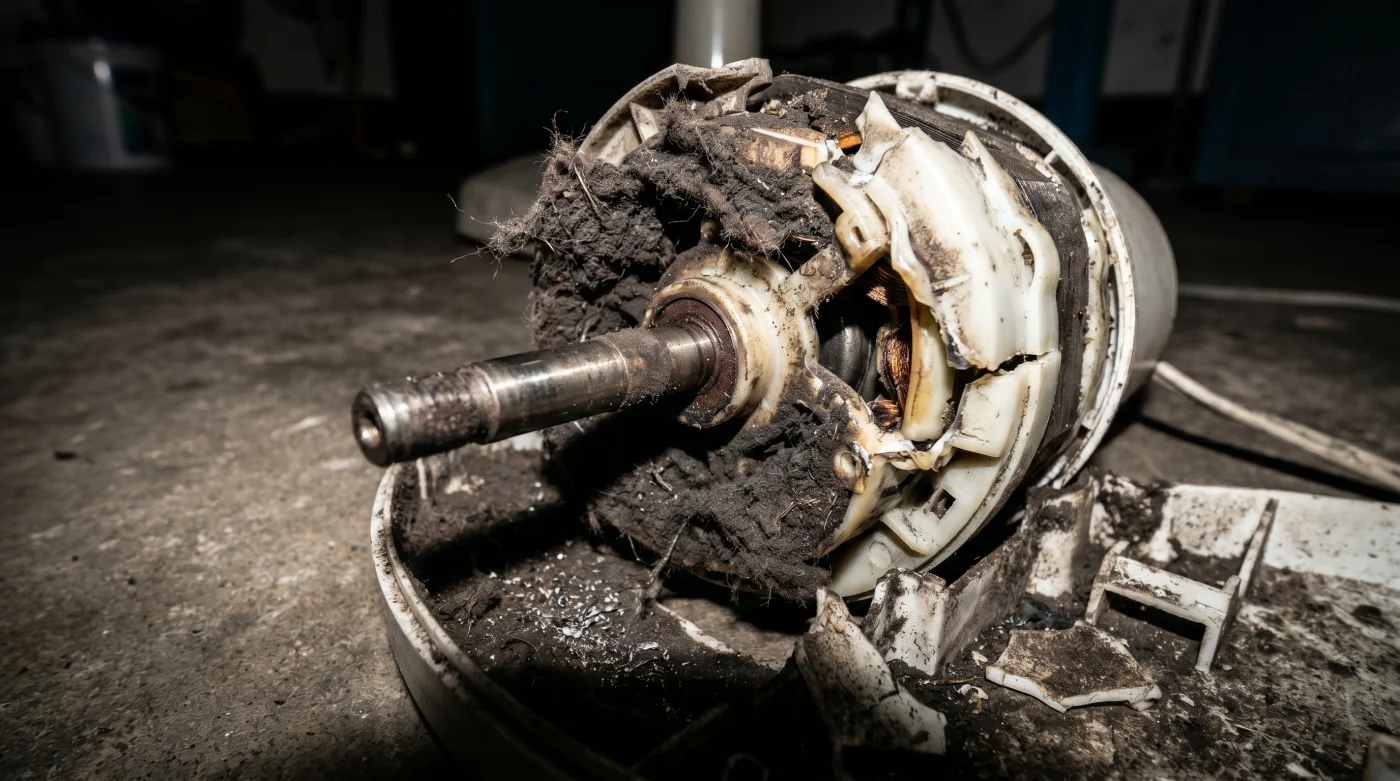 En su banco de trabajo, Hernán diagnostica el mismo problema una y otra vez. El motor se esfuerza con tanta desesperación para compensar la resistencia aerodinámica de la suciedad que **termina derritiendo sus propios soportes** por el calor interno. Cuando el plástico fundido deforma la base del eje central, el equipo queda sentenciado a la basura.